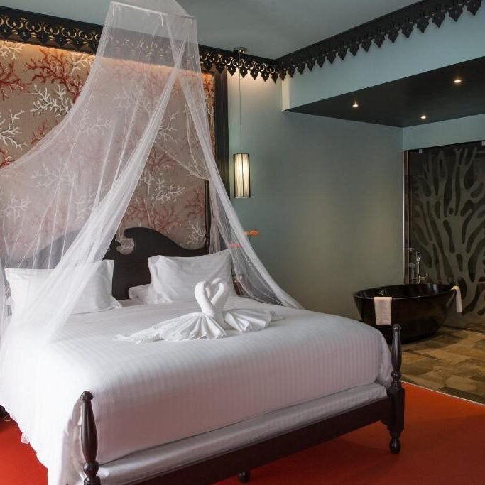 Each Junior Suite features a unique decor that reflects the Creole spirit of La Réunion. Two distinct atmospheres are available depending on your choice of hotel wing: on the garden side, the warm and exotic tones of the Perroquets wing create a soothing ambiance. On the Indian Ocean side, lagoon-inspired colors and proximity to the pool invite you to relax, especially during sunset.